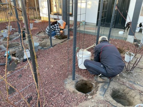 まずは何処に何を植えるかシミュレーションし、穴を掘っていきます。