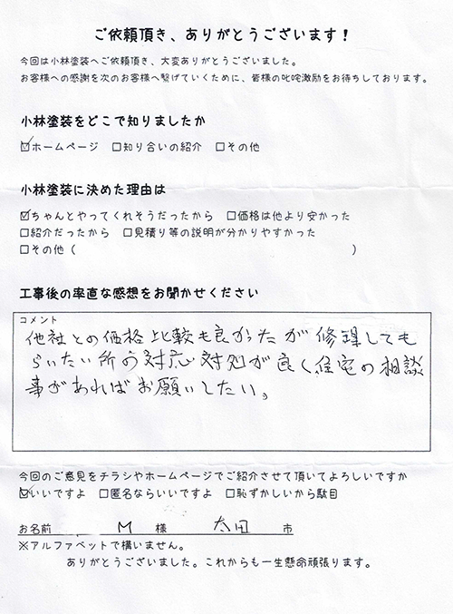 太田市で施工のM様からのアンケート | 太田市の外壁塗装は小林塗装