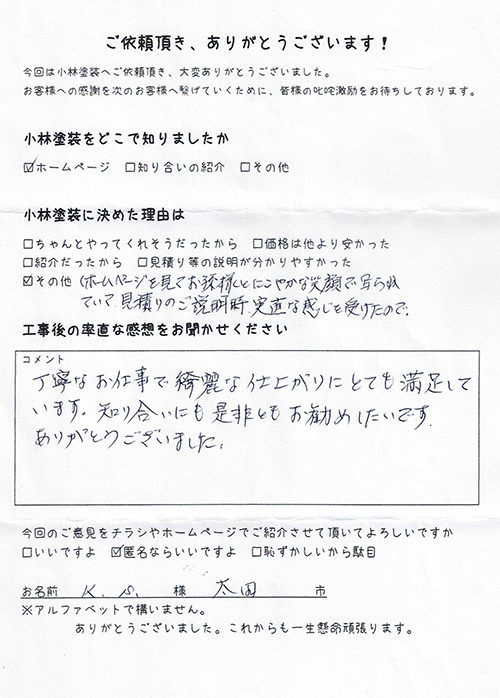 太田市で施工のS様からのアンケート | 太田市の外壁塗装は小林塗装